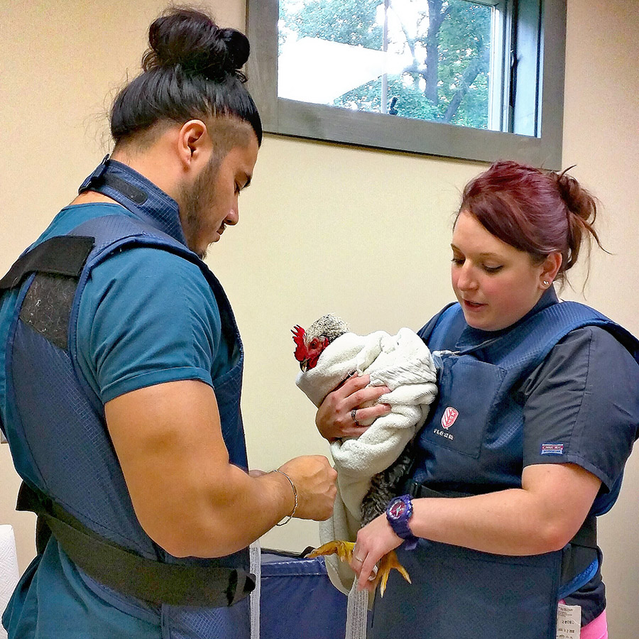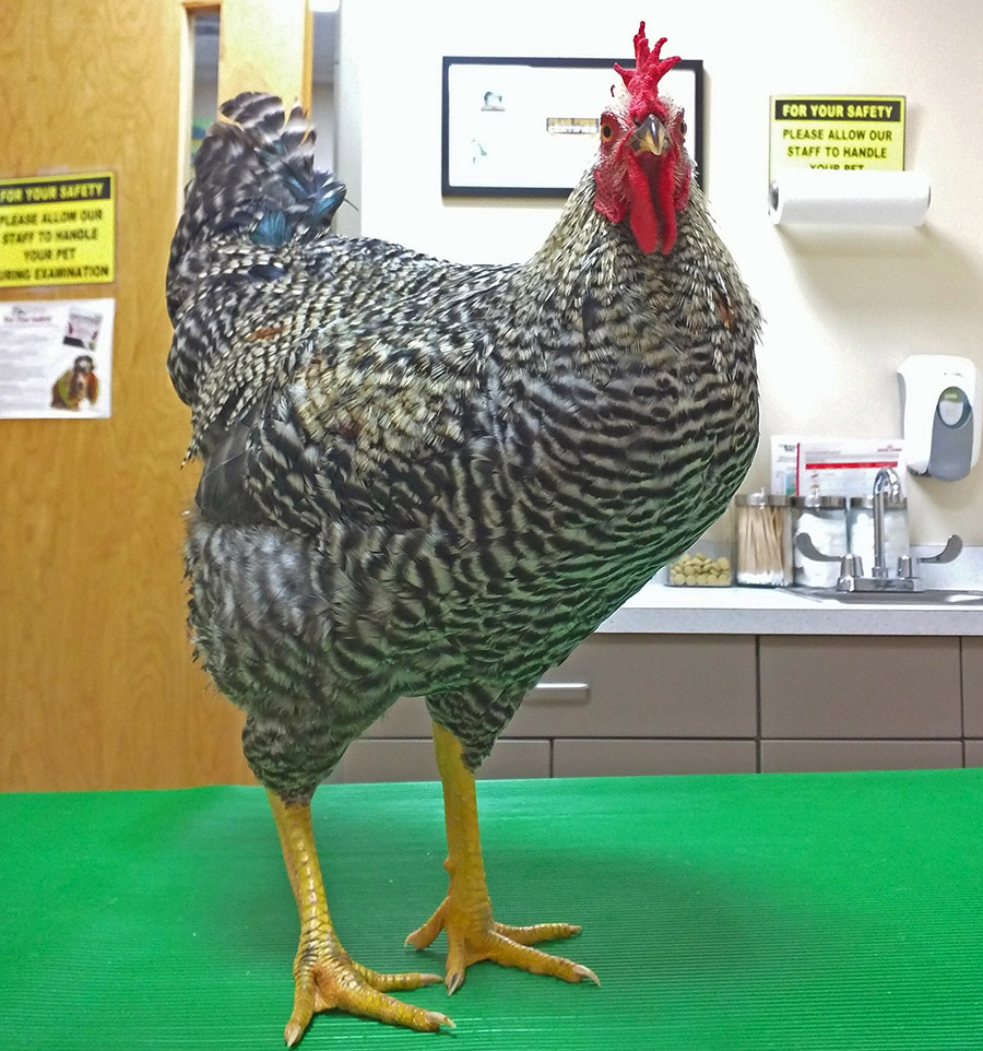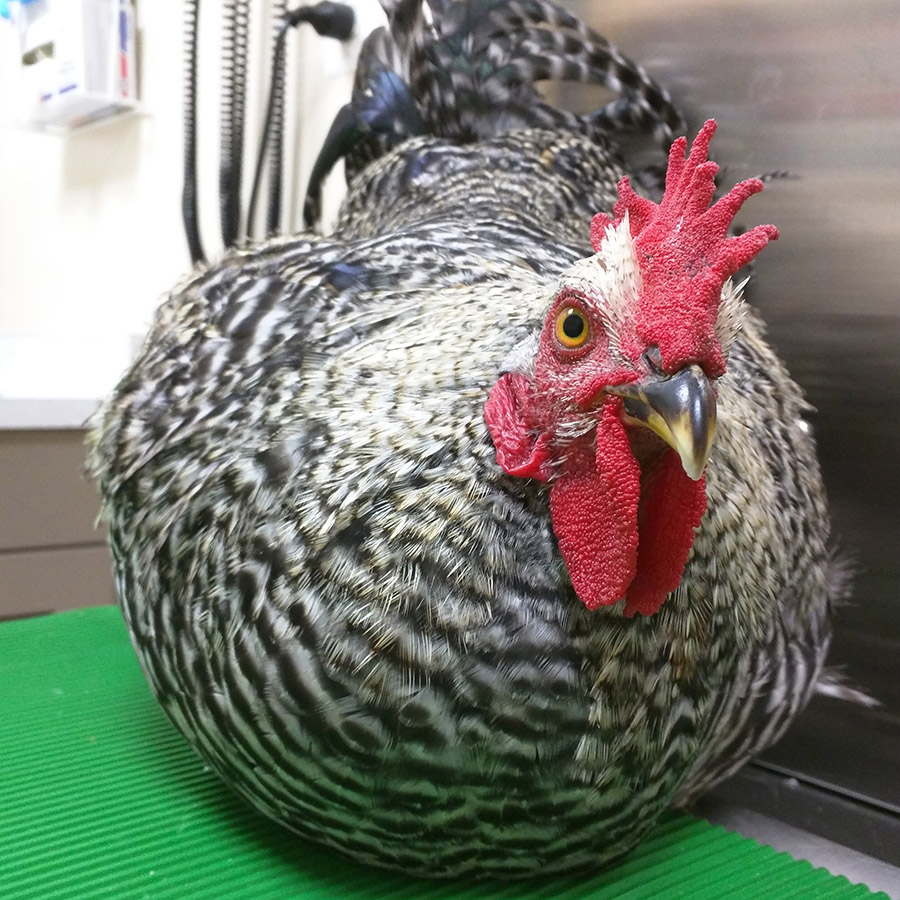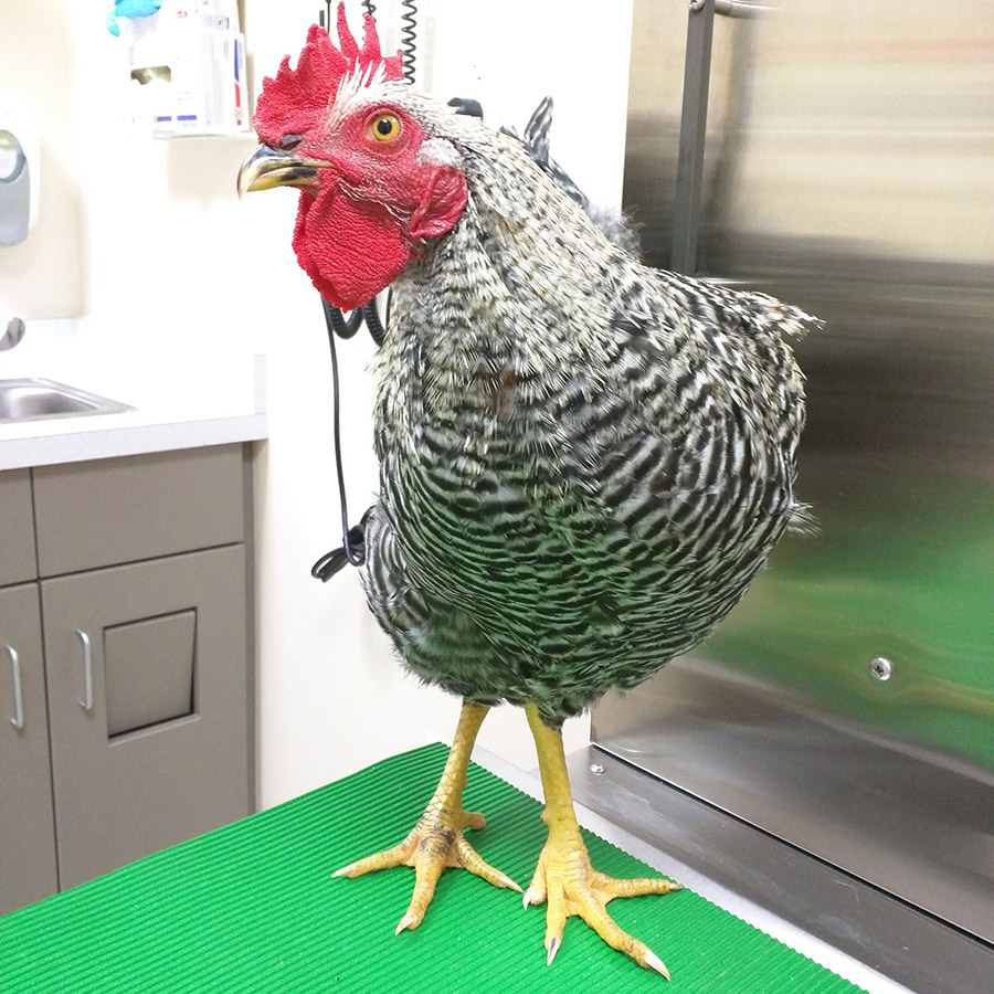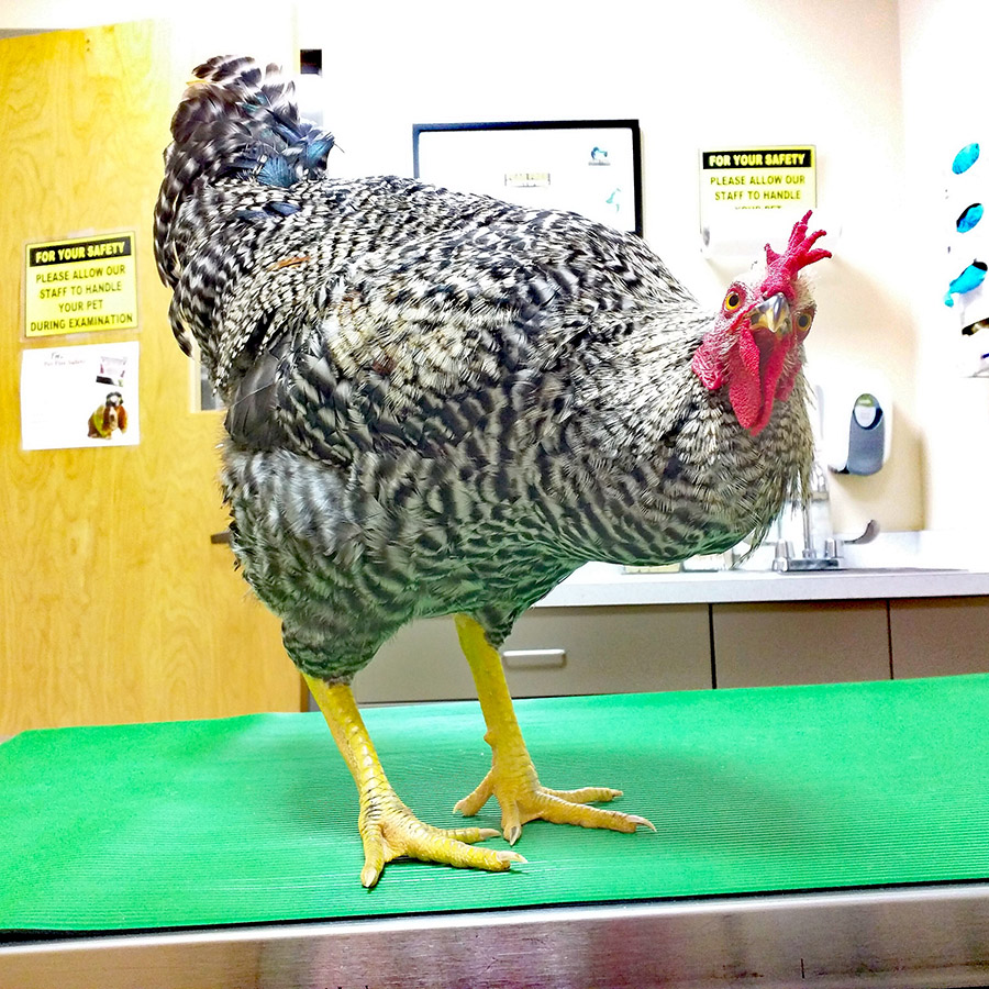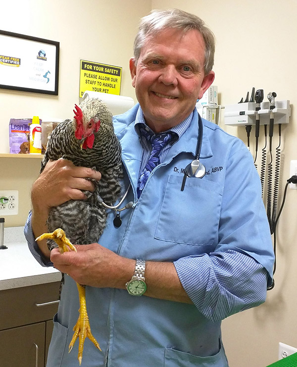 Kelly decided she needed to find a veterinarian nearby who would see him. So she tried reaching out to several veterinarians in the area to see whether they would treat a chicken with an injured foot. “Sorry, we don’t treat chickens,” was the common response to her inquiries. Marie called Leesburg Veterinary Hospital. The receptionist who answered the phone enthusiastically expressed how they would be happy to make an appointment for Checkers to see Dr. Michael Strickland.