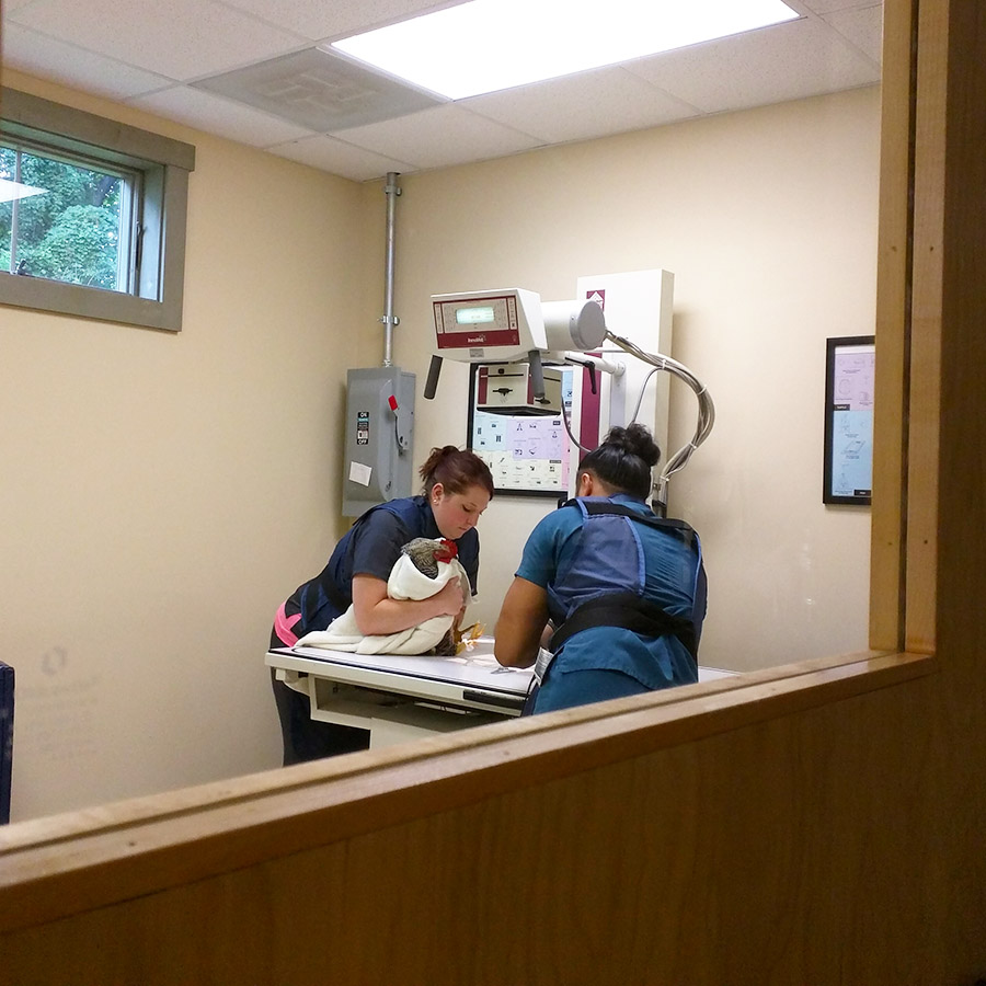 Nurse Olivia Armond came and gently collected Checkers and brought him into the radiology room. She was joined by another technician who both worked together to swiftly capture the appropriate angles of Checkers’ foot for Dr. Strickland to be able to assess the severity of his injury. They never had to administer any sedatives to Checkers.