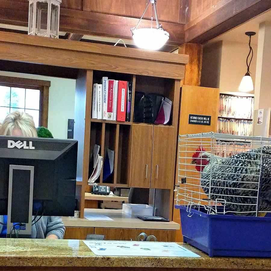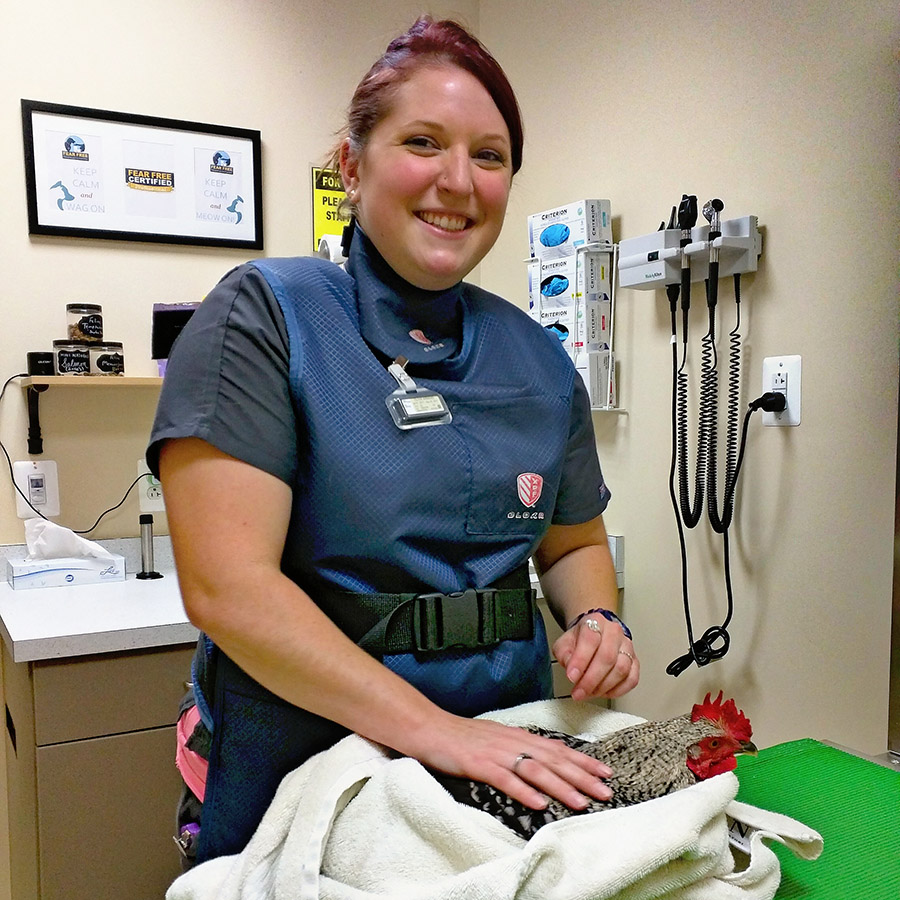 Marie arrived at the Leesburg Veterinary Hospital the following afternoon with Checkers. As she walked through the front doors with Checkers, she was cheerfully greeted by several of the hospital staff. As soon as they realized who Checkers was---a rooster, they all came up to see him and say hello. Within two minutes of arrival, Kelly and Checkers were brought back into one of the examination rooms.
