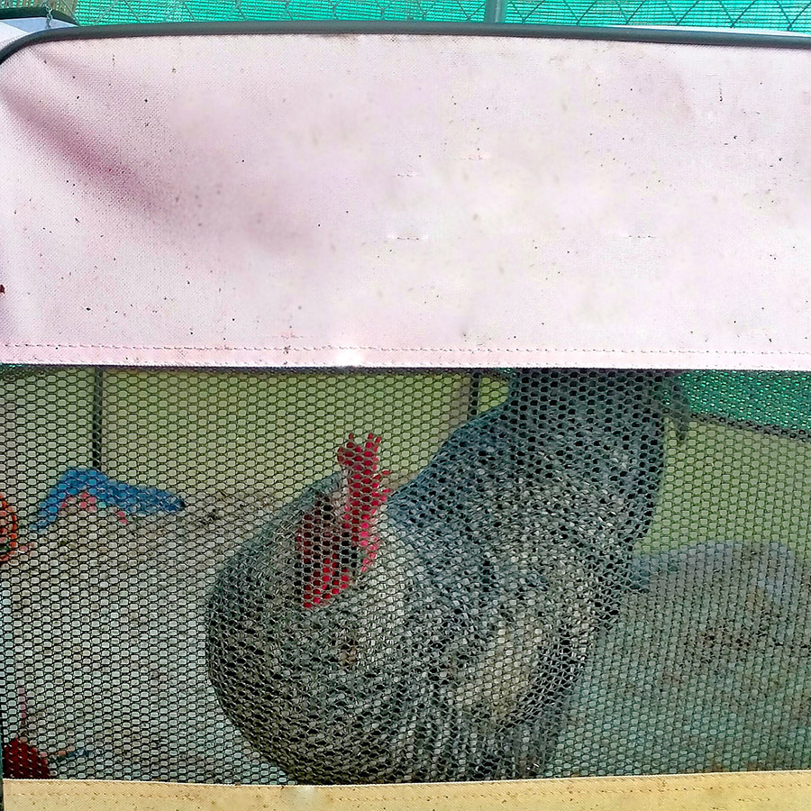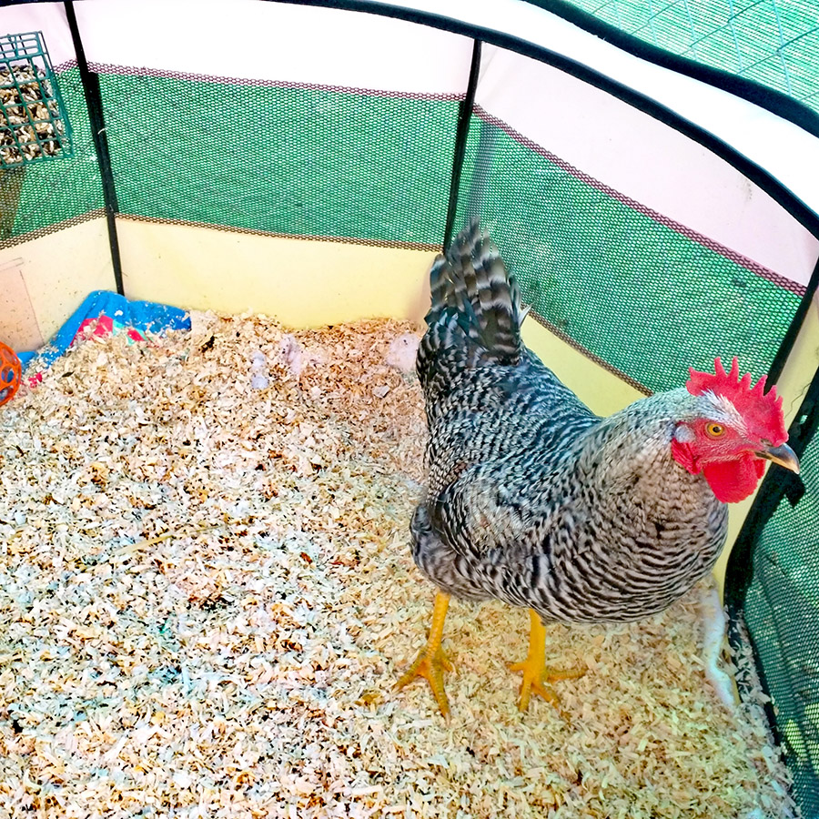 All of a sudden, she heard a loud distress scream from one of the chickens and noticed Checkers was limping. She quickly scooped him up in her arms and looked at his foot. Other than a minor scrape, there was no obvious external damage and nothing was bleeding. Until she knew what she was dealing with, Kelly didn’t want any additional stress on the foot, so she set Checkers up in a small recovery pen within the bird enclosure.