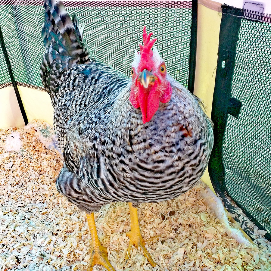 Checkers is a 7-month-old Barred Plymouth Rock Rooster who had his foot accidentally stepped on by a horse. He and his brother, General Zod, were new additions to Kelly’s ‘Rooster Run’--- a second enclosure she built to take in any roosters in the area which needed a home. Both the rooster run, and the original run were situated inside the pasture where she boards her horse, Cash. Cash is a very sweet, older horse who has always been known for being very kind and gentle to smaller animals. Because of his gentle nature, Kelly never thought there would be a problem with the chickens grazing near him while she let them out of their enclosures for their daily free ranging session. The newest roosters in the flock tended to gravitate towards Cash, and they frequently grazed together.