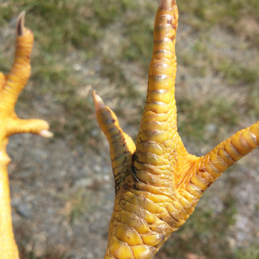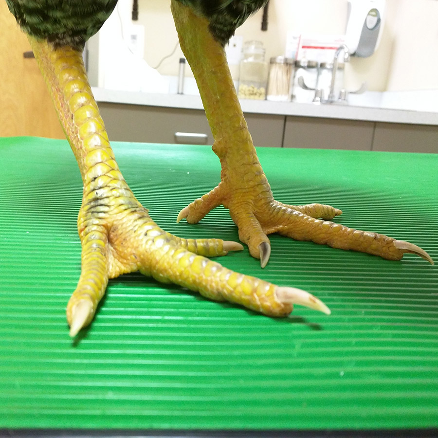 The next day, Kelly inspected Checkers’ foot for any changes from the day before. It was slightly swollen and Checkers was still lame. She noticed that he would frequently stand on the non-injured foot while holding up the injured one. By the third day, some faint green discoloration (in chickens this is how they bruise) appeared on his foot. By the fourth day post injury, Checkers’ foot still had not gotten any better.