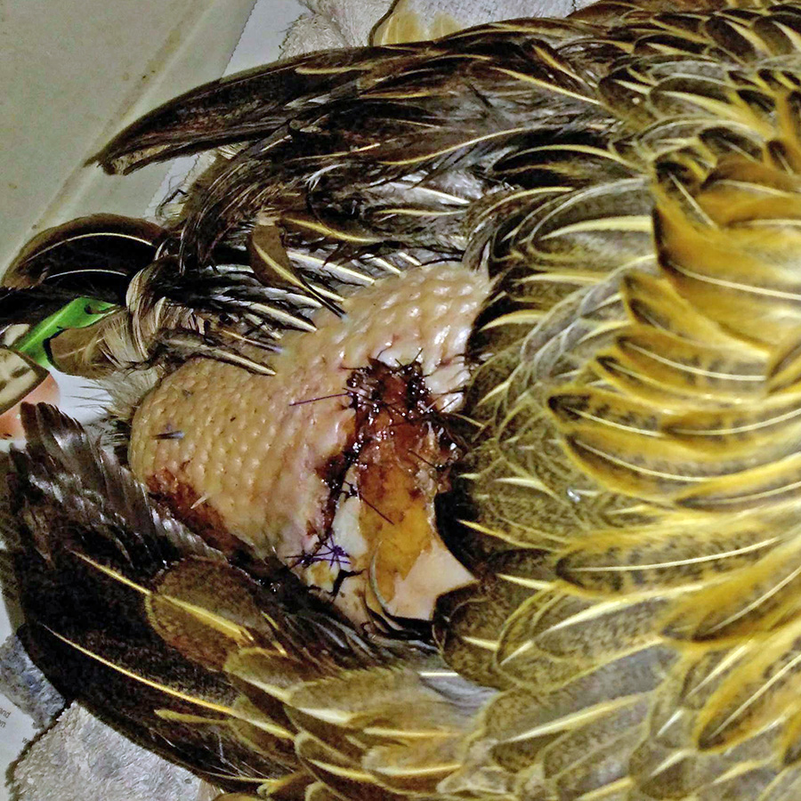 Anesthesia was induced and Judy was intubated and maintained on 2% isoflurane and 1 L/min oxygen for the next 45 minutes. During this time, he plucked, cleaned, debrided, flushed the wound with saline and chlorhexidine solution, and sutured closed. Judy was started on a 3-day course of injectable antibiotics and pain medication. After 3 days, she was switched to oral antibiotics. The antibiotics were important because dogs (both domestic and wild) carry lots of potentially harmful bacteria in their mouths, which gets passed into the bird when attacked.