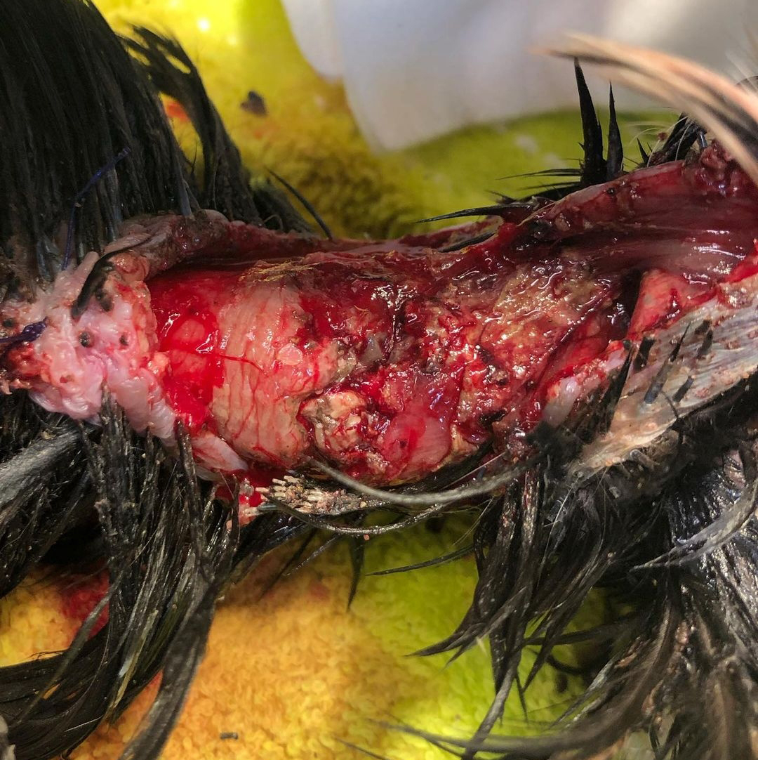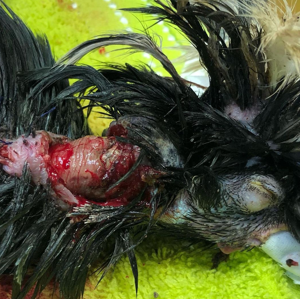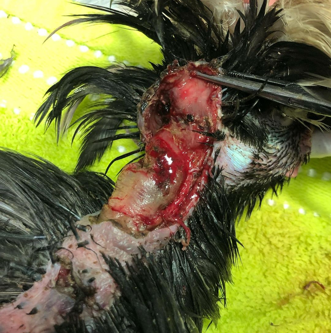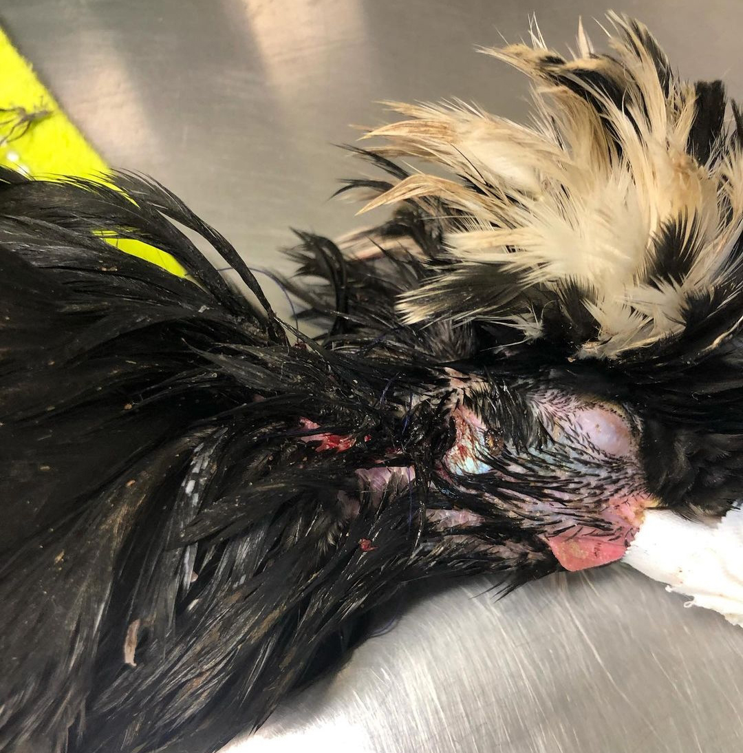 Upon arrival, Pepper Pot was still alert but Dr. Rebecca Gounaris could tell that she was in pain. On examination, Dr. Rebecca found a large open wound at the base of Pepper Pot’s skull that extended down her neck. When further explored, Dr. Rebecca discovered that the hen had been pecked so badly, that her muscle, tendons, and even veins were completely exposed. Luckily, nothing was damaged.