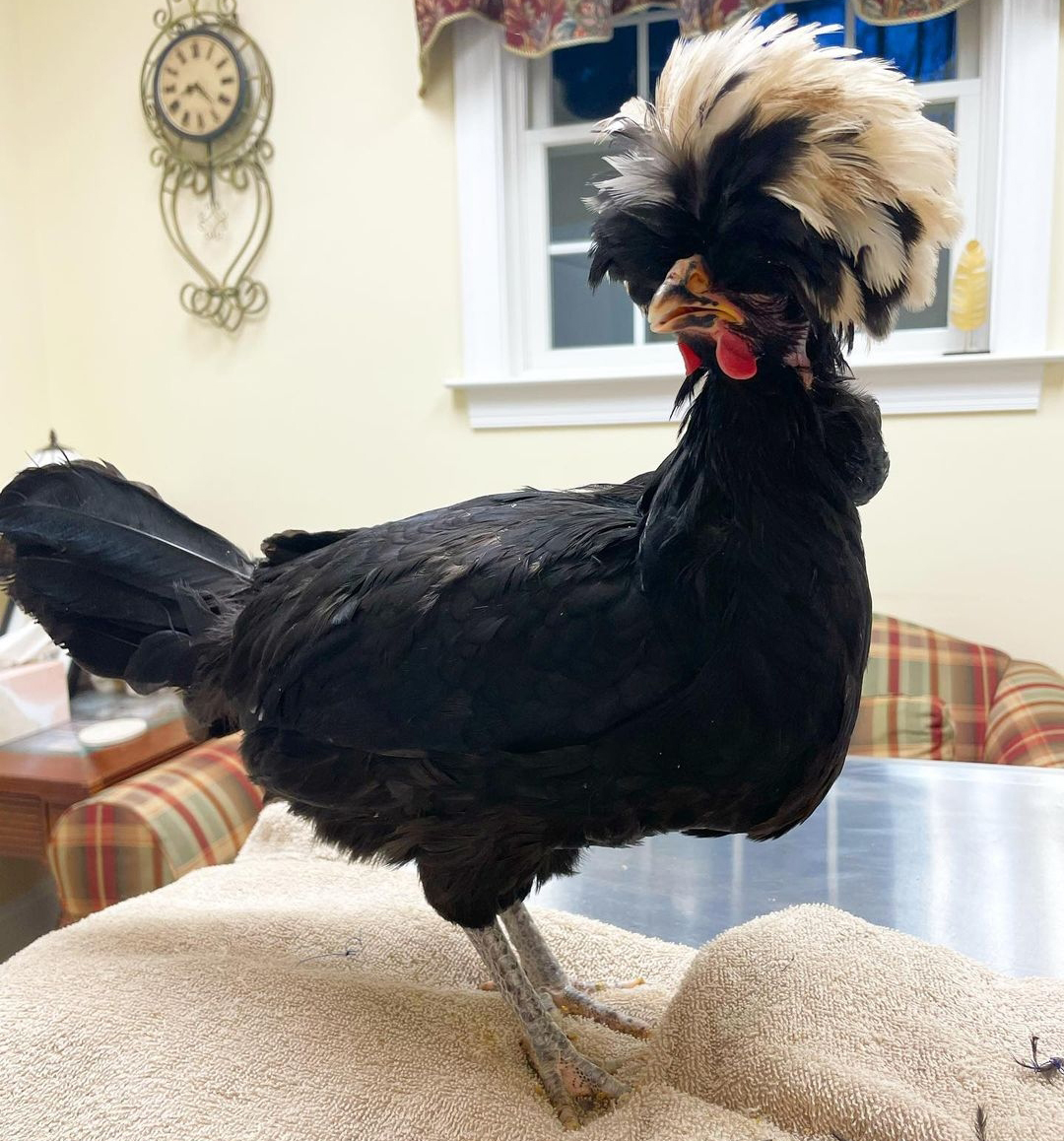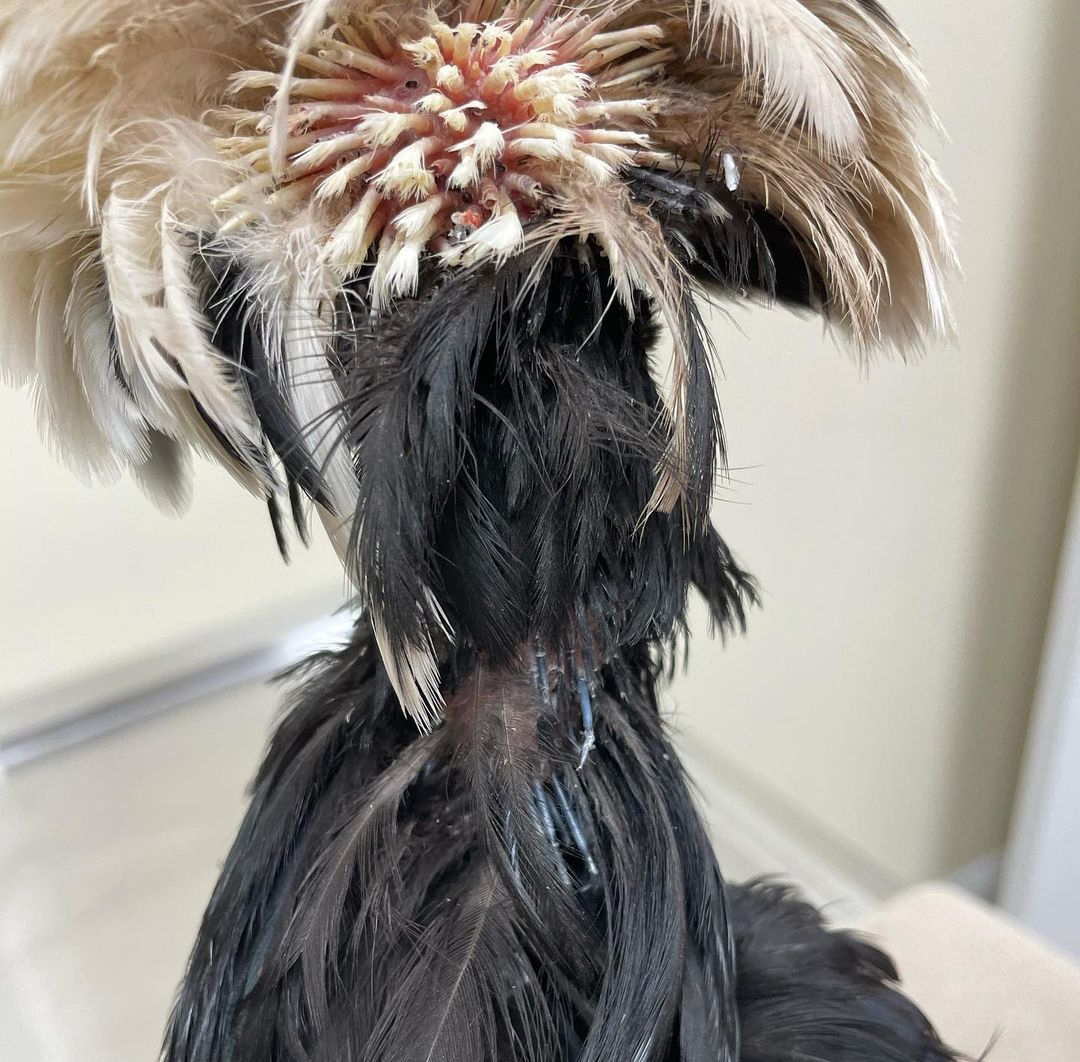 Pepper Pot is a Crested Polish hen who was the victim of aggressive pecking. Her owners were trying to introduce their Polish chickens to an established flock of Rhode Island Reds. They noticed that Pepper Pot was getting picked on by the other birds, and removed her from the flock. To their dismay, the skin covering the back of Pepper Pot’s head was completely gone. Recognizing the severity and urgency of the situation, they immediately sought veterinary care and brought her to Dr. Rebecca Gounaris at the Pleasantville Animal Hospital of Fallston.