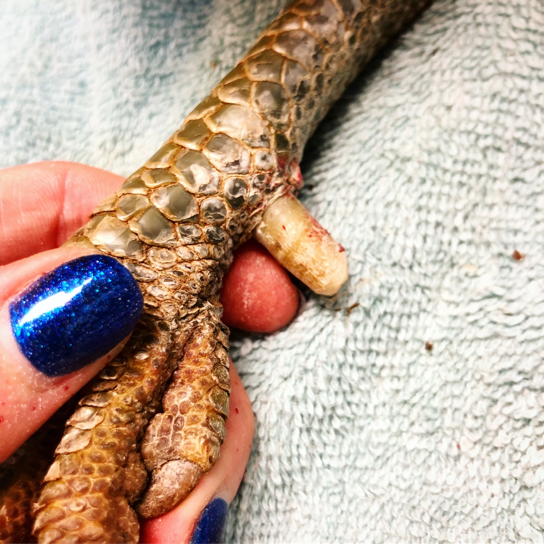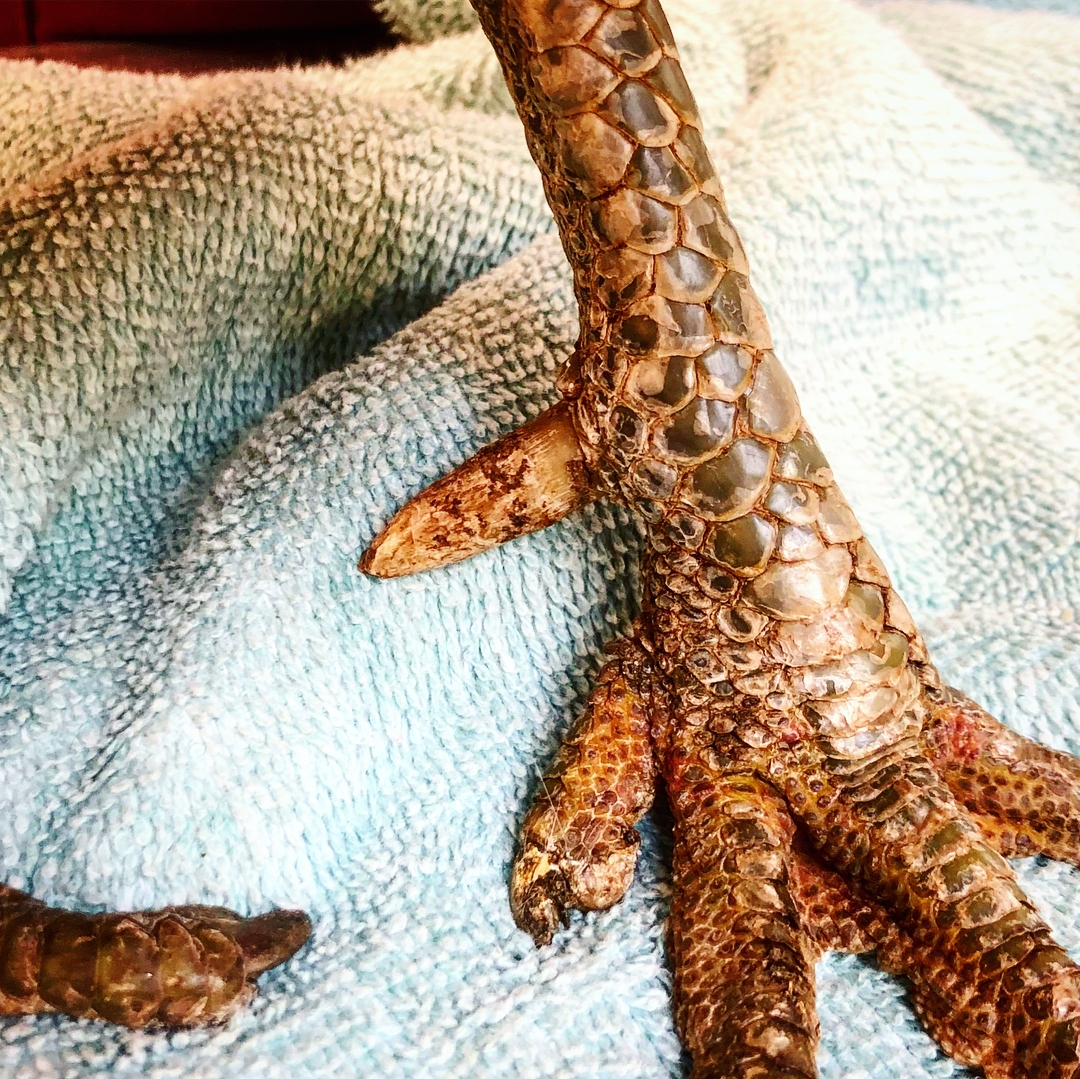 RoRo the rooster visited us today to have his spurs trimmed down! Roosters have spurs on their feet that are used as a natural weapon to protect themselves and their flock. The spur is mass of underlying bone surrounded by a sheath of keratin, which is very similar to the anatomy of a rhinoceros horn!