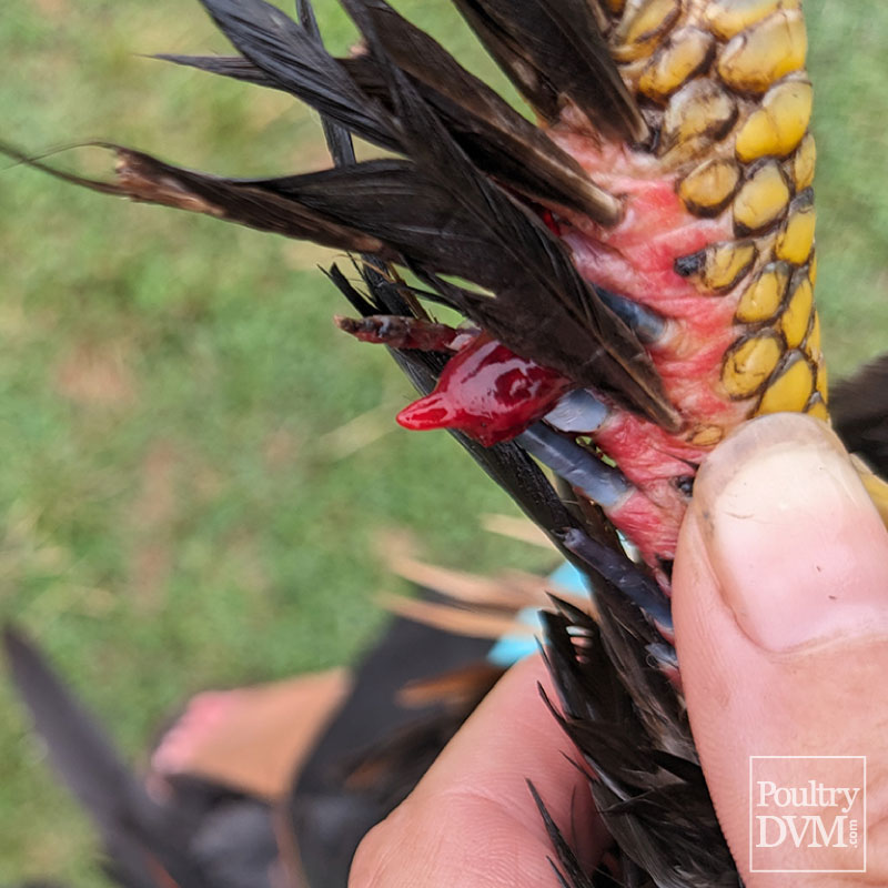 If a pin feather is damaged during the regrowth process, it can bleed heavily due to the active blood supply flowing through the sheath. This heavy bleeding can cause the chicken to lose a lot of blood in a short amount of time. Therefore, it is important to quickly intervene and try to stop the bleeding.