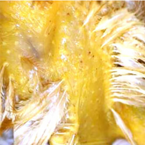 Cutaneous mucinosis has previously only been described in humans, dogs (particularly the Chinese Shar-Pei dog breed), and sometimes cats. In it's vesicular form, the syndrome manifests as the development of small, translucent, blister-like bubbles (technically referred to as vesicles) on the skin of the legs, shanks, and feet of affected chickens. These vesicles are fragile and as such are highly susceptible rupturing and leaking out a sticky substance, which is the hyaluronic acid. This weak skin barrier makes affected chickens more susceptible to bacterial skin infections.