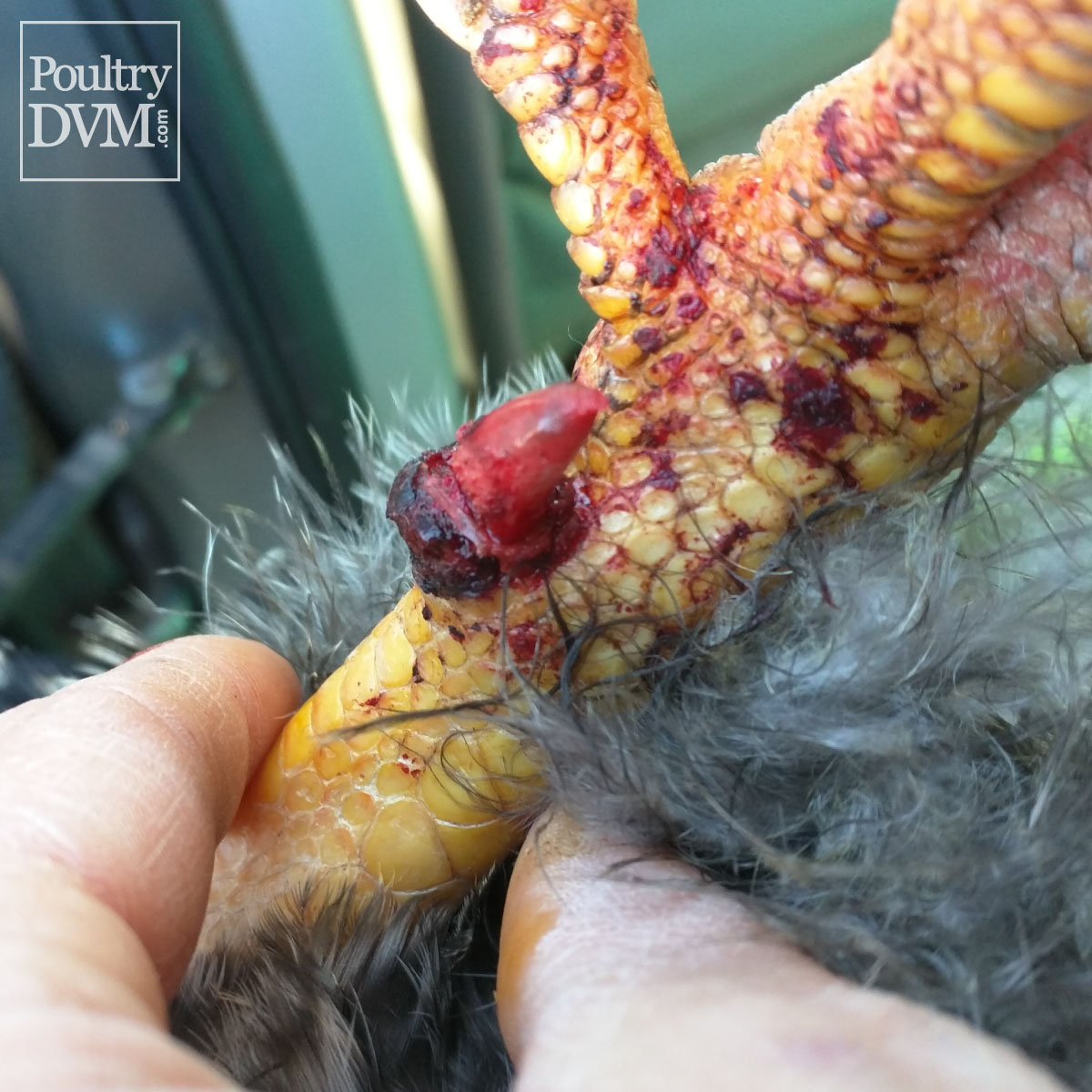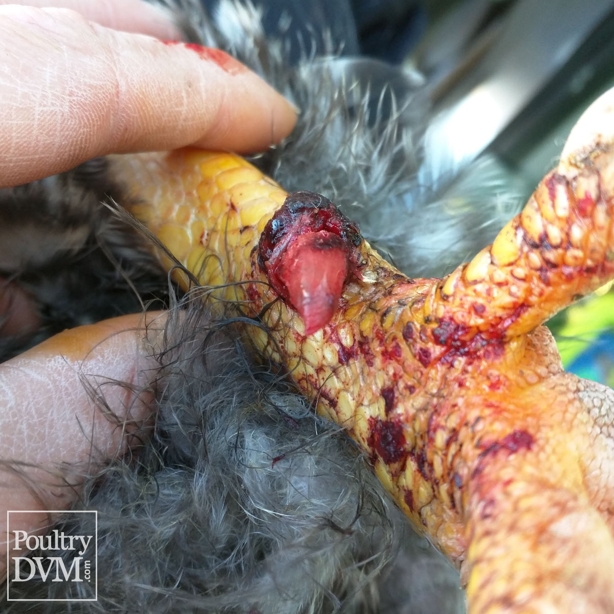 Wound care: Promptly cleaned with an antiseptic, dressing applied and bandaged. There will be a significant amount of blood loss so if the injury is discovered quickly, blood loss should be controlled with septic powder and pressure applied with gauze until it stops. The injured leg should be kept bandaged since the bird will be at high risk of bacteria entering which can lead to an infection of the bone.: