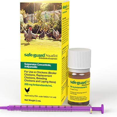 Fenbendazole (brand names Panacur® and Safe-Guard®) is a benzimidazole anthelmintic used 'off label' to treat a variety of intestinal parasites (e.g., roundworms, flukes, certain types of tapeworms, and Giardia) in pet poultry. Fenbendazole can be administered to each chicken orally by syringe, or added the flock’s drinking water source. Fenbendazole may not be effective against Capillaria spp.