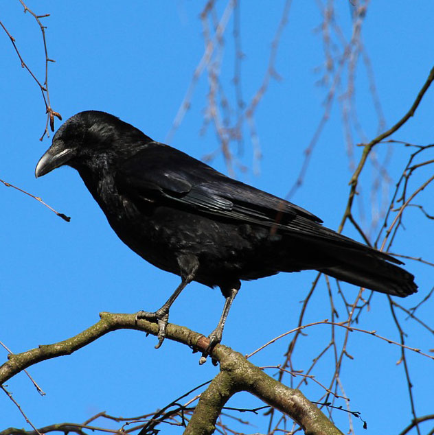 Crows are considered to be among the most adaptable and intelligent birds. Crows are omnivorous and will eat almost anything. Thy are found in many different habitats, including woods, meadows, marshes, fields, riparian areas, towns and cities. Although solitary or seen in pairs much of the time, crows can also be gregarious; during the fall and winter they may gather in very large roosts near a source of food.